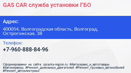 GAS CAR, служба установки ГБО по адресу 400054, Волгоградская область, Волгоград, Острогожская, 38 в дальнейшем Организация, размещена в следующих категориях: