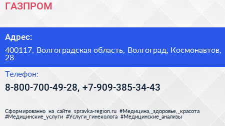 ГАЗПРОМ по адресу 400117, Волгоградская область, Волгоград, Космонавтов, 28 в дальнейшем Организация, размещена в следующих категориях: