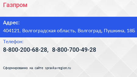 Газпром по адресу 404121, Волгоградская область, Волгоград, Пушкина, 18Б в дальнейшем Организация, размещена в следующих категориях: