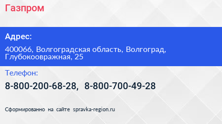 Газпром по адресу 400066, Волгоградская область, Волгоград, Глубокоовражная, 25 в дальнейшем Организация, размещена в следующих категориях: