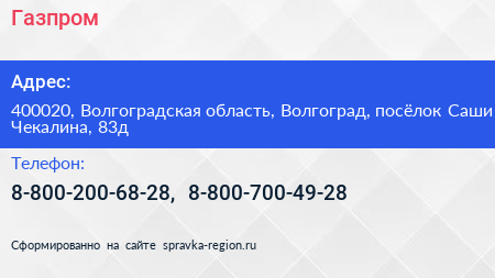 Газпром по адресу 400020, Волгоградская область, Волгоград, посёлок Саши Чекалина, 83д в дальнейшем Организация, размещена в следующих категориях: