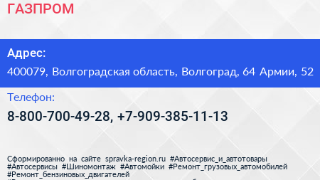 ГАЗПРОМ по адресу 400079, Волгоградская область, Волгоград, 64 Армии, 52 в дальнейшем Организация, размещена в следующих категориях: