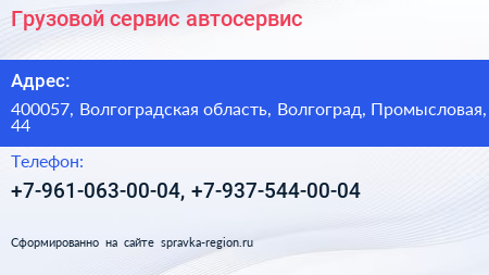 Грузовой сервис, автосервис по адресу 400057, Волгоградская область, Волгоград, Промысловая, 44 в дальнейшем Организация, размещена в следующих категориях: