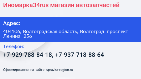 Иномарка34rus, магазин автозапчастей по адресу 404106, Волгоградская область, Волгоград, проспект Ленина, 256 в дальнейшем Организация, размещена в следующих категориях: