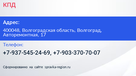 КПД по адресу 400048, Волгоградская область, Волгоград, Авторемонтная, 17 в дальнейшем Организация, размещена в следующих категориях: