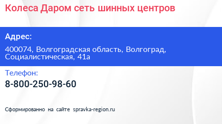 Колеса Даром, сеть шинных центров по адресу 400074, Волгоградская область, Волгоград, Социалистическая, 41а в дальнейшем Организация, размещена в следующих категориях: