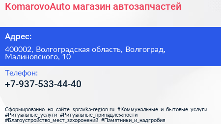 KomarovoAuto, магазин автозапчастей по адресу 400002, Волгоградская область, Волгоград, Малиновского, 10 в дальнейшем Организация, размещена в следующих категориях: