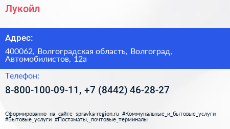 Лукойл по адресу 400062, Волгоградская область, Волгоград, Автомобилистов, 12а в дальнейшем Организация, размещена в следующих категориях: