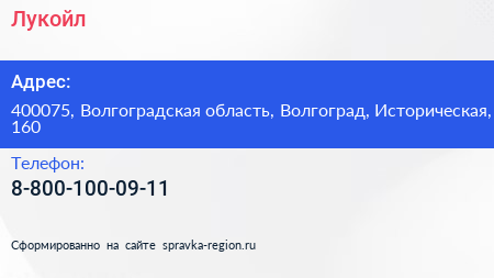 Лукойл по адресу 400075, Волгоградская область, Волгоград, Историческая, 160 в дальнейшем Организация, размещена в следующих категориях: