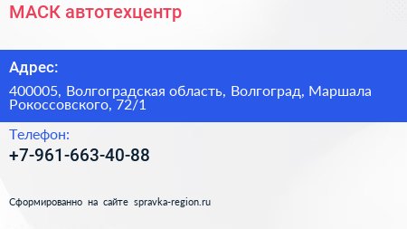 МАСК, автотехцентр по адресу 400005, Волгоградская область, Волгоград, Маршала Рокоссовского, 72/1 в дальнейшем Организация, размещена в следующих категориях: