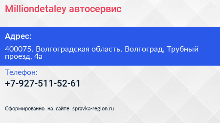 Milliondetaley, автосервис по адресу 400075, Волгоградская область, Волгоград, Трубный проезд, 4а в дальнейшем Организация, размещена в следующих категориях:
