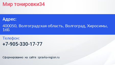 Мир тонировки34 по адресу 400050, Волгоградская область, Волгоград, Хиросимы, 16Б в дальнейшем Организация, размещена в следующих категориях: