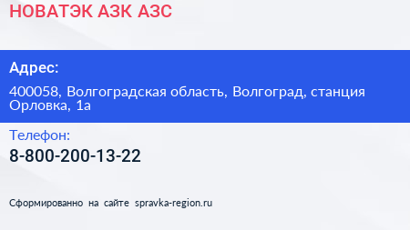 НОВАТЭК-АЗК, АЗС по адресу 400058, Волгоградская область, Волгоград, станция Орловка, 1а в дальнейшем Организация, размещена в следующих категориях:
