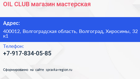 OIL CLUB, магазин-мастерская по адресу 400012, Волгоградская область, Волгоград, Хиросимы, 32 к1 в дальнейшем Организация, размещена в следующих категориях: