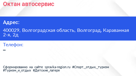 Октан, автосервис по адресу 400029, Волгоградская область, Волгоград, Караванная 2-я, 2д в дальнейшем Организация, размещена в следующих категориях: