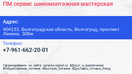 ПМ-сервис, шиномонтажная мастерская по адресу 404133, Волгоградская область, Волгоград, проспект Ленина, 308ж в дальнейшем Организация, размещена в следующих категориях: