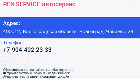 REN-SERVICE, автосервис по адресу 400012, Волгоградская область, Волгоград, Чапаева, 28 в дальнейшем Организация, размещена в следующих категориях: