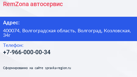 RemZona, автосервис по адресу 400074, Волгоградская область, Волгоград, Козловская, 34г в дальнейшем Организация, размещена в следующих категориях: