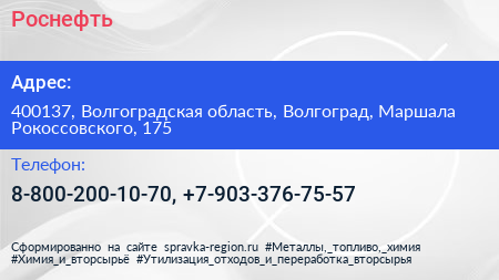 Роснефть по адресу 400137, Волгоградская область, Волгоград, Маршала Рокоссовского, 175 в дальнейшем Организация, размещена в следующих категориях: