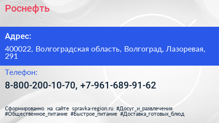 Роснефть по адресу 400022, Волгоградская область, Волгоград, Лазоревая, 291 в дальнейшем Организация, размещена в следующих категориях:
