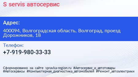 S-servis, автосервис по адресу 400094, Волгоградская область, Волгоград, проезд Дорожников, 18 в дальнейшем Организация, размещена в следующих категориях: