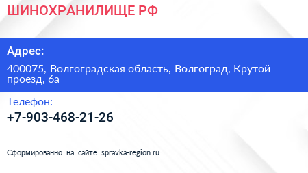 ШИНОХРАНИЛИЩЕ.РФ по адресу 400075, Волгоградская область, Волгоград, Крутой проезд, 6а в дальнейшем Организация, размещена в следующих категориях: