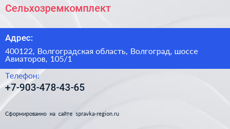 Сельхозремкомплект по адресу 400122, Волгоградская область, Волгоград, шоссе Авиаторов, 105/1 в дальнейшем Организация, размещена в следующих категориях: