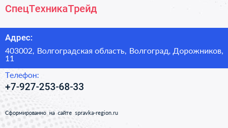 СпецТехникаТрейд по адресу 403002, Волгоградская область, Волгоград, Дорожников, 11 в дальнейшем Организация, размещена в следующих категориях: