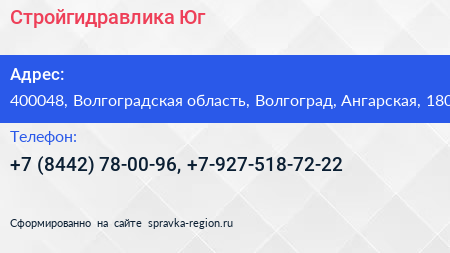 Стройгидравлика Юг по адресу 400048, Волгоградская область, Волгоград, Ангарская, 180 в дальнейшем Организация, размещена в следующих категориях: