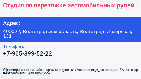 Студия по перетяжке автомобильных рулей по адресу 400022, Волгоградская область, Волгоград, Лазоревая, 131 в дальнейшем Организация, размещена в следующих категориях: