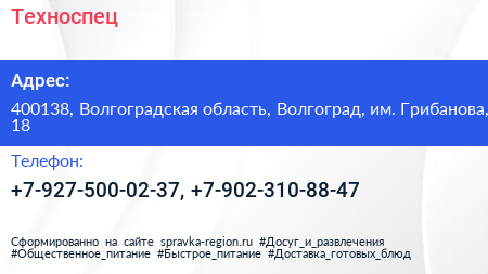 Техноспец по адресу 400138, Волгоградская область, Волгоград, им. Грибанова, 18 в дальнейшем Организация, размещена в следующих категориях: