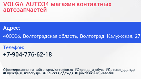 VOLGA-AUTO34, магазин контактных автозапчастей по адресу 400006, Волгоградская область, Волгоград, Калужская, 27 в дальнейшем Организация, размещена в следующих категориях: