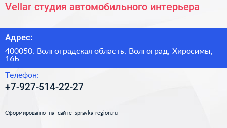 Vellar, студия автомобильного интерьера по адресу 400050, Волгоградская область, Волгоград, Хиросимы, 16Б в дальнейшем Организация, размещена в следующих категориях: