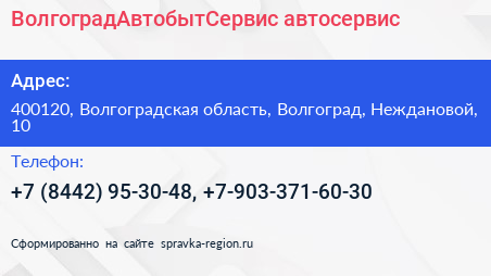 ВолгоградАвтобытСервис, автосервис по адресу 400120, Волгоградская область, Волгоград, Неждановой, 10 в дальнейшем Организация, размещена в следующих категориях: