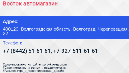 Восток, автомагазин по адресу 400120, Волгоградская область, Волгоград, Череповецкая, 22 в дальнейшем Организация, размещена в следующих категориях: