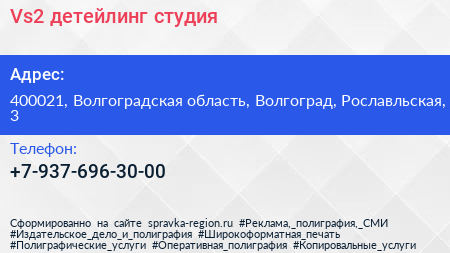 Vs2, детейлинг-студия по адресу 400021, Волгоградская область, Волгоград, Рославльская, 3 в дальнейшем Организация, размещена в следующих категориях: