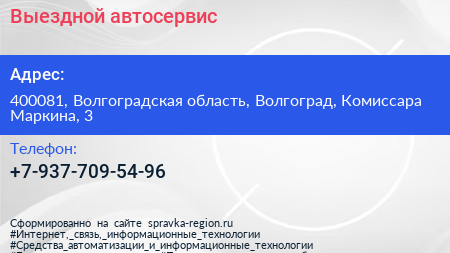 Выездной автосервис по адресу 400081, Волгоградская область, Волгоград, Комиссара Маркина, 3 в дальнейшем Организация, размещена в следующих категориях: