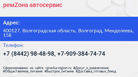 ремZона, автосервис по адресу 400127, Волгоградская область, Волгоград, Менделеева, 158 в дальнейшем Организация, размещена в следующих категориях: