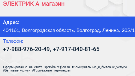 ЭЛЕКТРИК.А, магазин по адресу 404161, Волгоградская область, Волгоград, Ленина, 205/1 в дальнейшем Организация, размещена в следующих категориях: