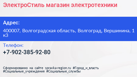 ЭлектроСтиль, магазин электротехники по адресу 400007, Волгоградская область, Волгоград, Вершинина, 1 к3 в дальнейшем Организация, размещена в следующих категориях: