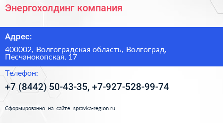 Энергохолдинг, компания по адресу 400002, Волгоградская область, Волгоград, Песчанокопская, 17 в дальнейшем Организация, размещена в следующих категориях: