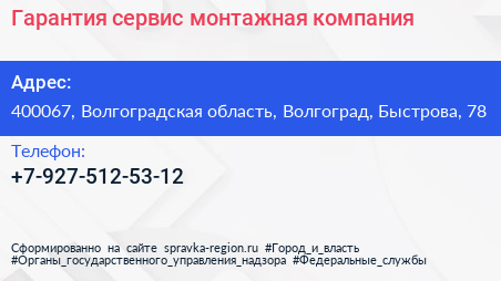 Гарантия-сервис, монтажная компания по адресу 400067, Волгоградская область, Волгоград, Быстрова, 78 в дальнейшем Организация, размещена в следующих категориях: