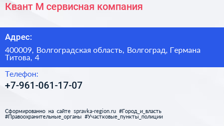 Квант-М, сервисная компания по адресу 400009, Волгоградская область, Волгоград, Германа Титова, 4 в дальнейшем Организация, размещена в следующих категориях: