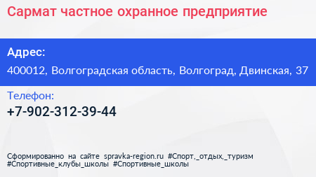 Сармат, частное охранное предприятие по адресу 400012, Волгоградская область, Волгоград, Двинская, 37 в дальнейшем Организация, размещена в следующих категориях:
