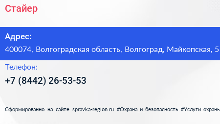 Стайер по адресу 400074, Волгоградская область, Волгоград, Майкопская, 5 в дальнейшем Организация, размещена в следующих категориях: