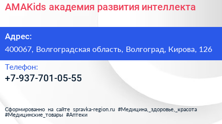 AMAKids, академия развития интеллекта по адресу 400067, Волгоградская область, Волгоград, Кирова, 126 в дальнейшем Организация, размещена в следующих категориях: