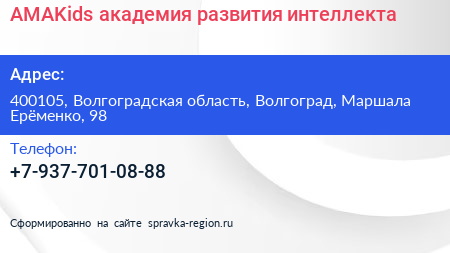 AMAKids, академия развития интеллекта по адресу 400105, Волгоградская область, Волгоград, Маршала Ерёменко, 98 в дальнейшем Организация, размещена в следующих категориях: