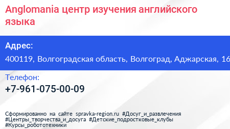 Anglomania, центр изучения английского языка по адресу 400119, Волгоградская область, Волгоград, Аджарская, 16 в дальнейшем Организация, размещена в следующих категориях:
