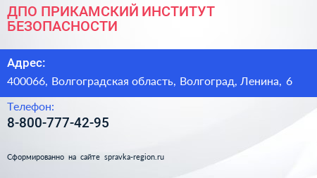 ДПО ПРИКАМСКИЙ ИНСТИТУТ БЕЗОПАСНОСТИ по адресу 400066, Волгоградская область, Волгоград, Ленина, 6 в дальнейшем Организация, размещена в следующих категориях: