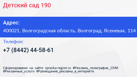 Детский сад №190 по адресу 400021, Волгоградская область, Волгоград, Ясеневая, 114 в дальнейшем Организация, размещена в следующих категориях: